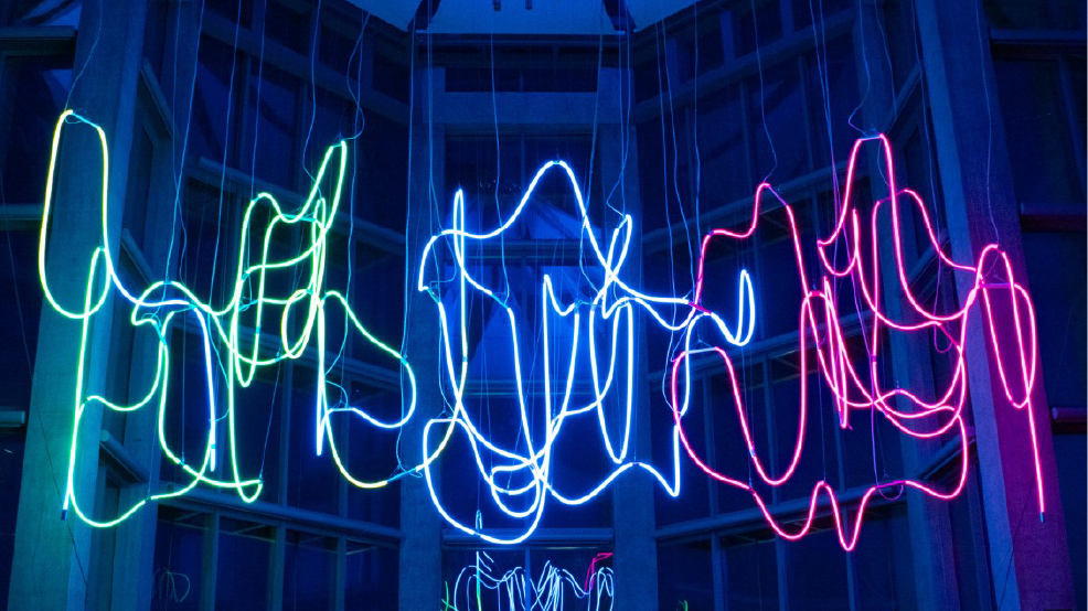 Les visiteurs s’expriment dans l’un des deux microphones placés aux extrémités d’un long fil lumineux. Les voix se déplacent le long de ce fil sous forme de faisceaux colorés, se mêlant pour créer des compositions mélodiques en constante évolution.